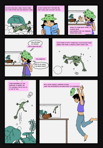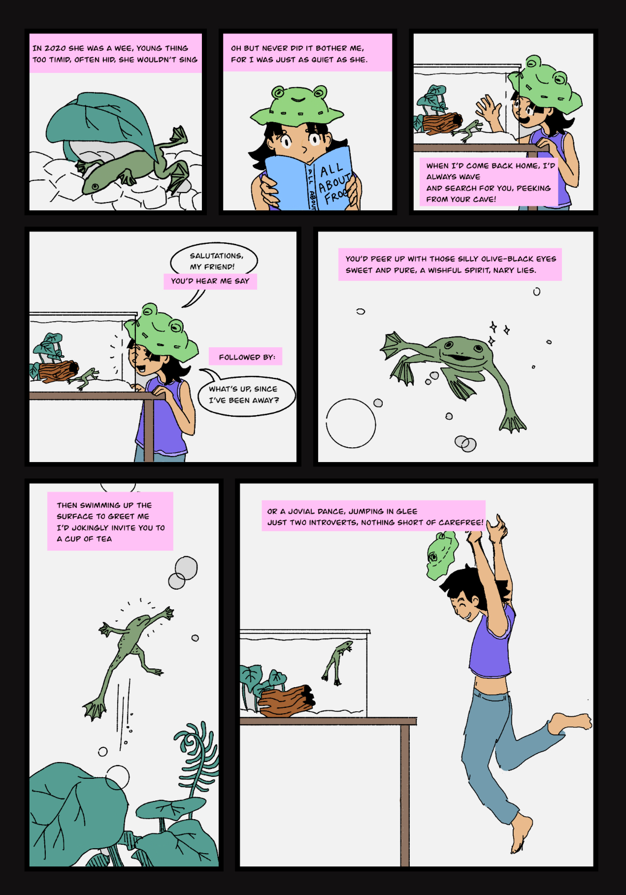 - Ode to a pet frog (about reminiscing a pet frog that passed away)